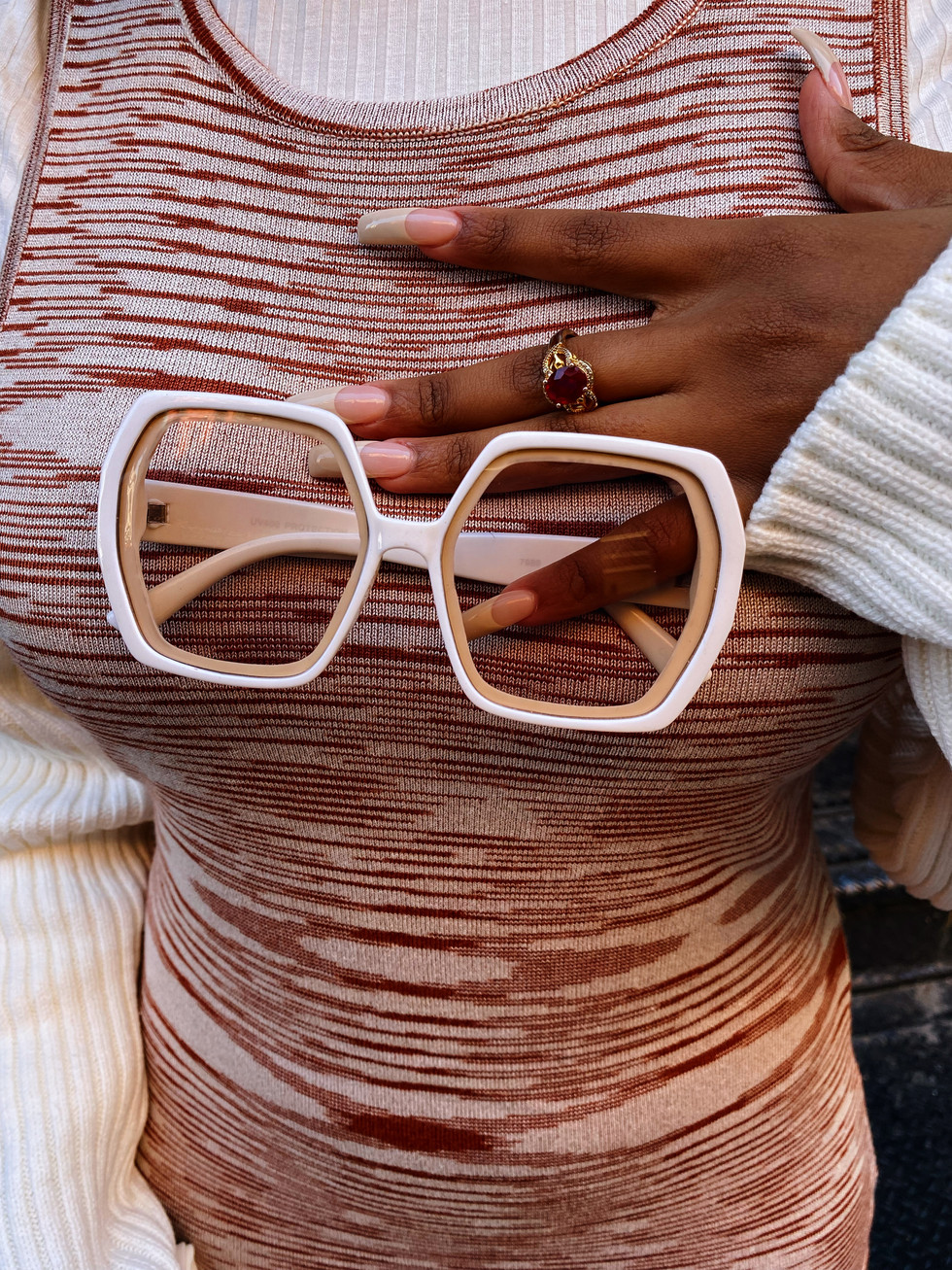 As pictured, I’m wearing a rust patterned knit dress with a white mock neck bodysuit and white knee high boots. To add a statement, I decided to layer a cream knit bolero sweater over the dress. Accessories are the key to any great look, so of course I added a ruched white bag and oversized cream shades.
