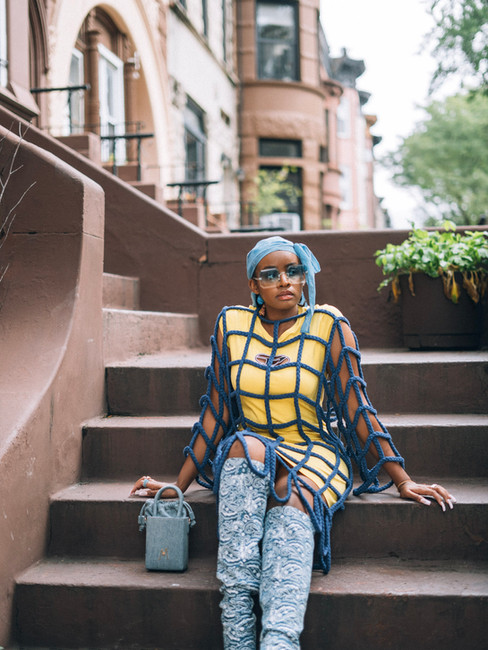 I closed out the week's festivities with my most edgy, boundary-pushing look to date. Casually, I wore a rope dress layered over a form-fitting minidress with bandana-print, denim boots. To take things a step further, I accessorized with a blue durag and '90s large frames, and a small denim tote. I was most proud of this look, because I stayed true to who I am while taking a risk, and in the most beautiful way, it just worked. I expressed myself by doing something that hadn't been done before, and that's what fashion is really all about.