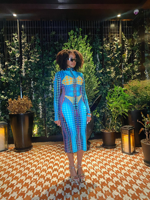 As pictured, I wore a bikini illusion midi dress with blue, yellow, green, and purple gradient dots and zip closure. While the garment is powerful enough, I wore silver platform heels and sunglasses to match for an even more "night-out" feel.